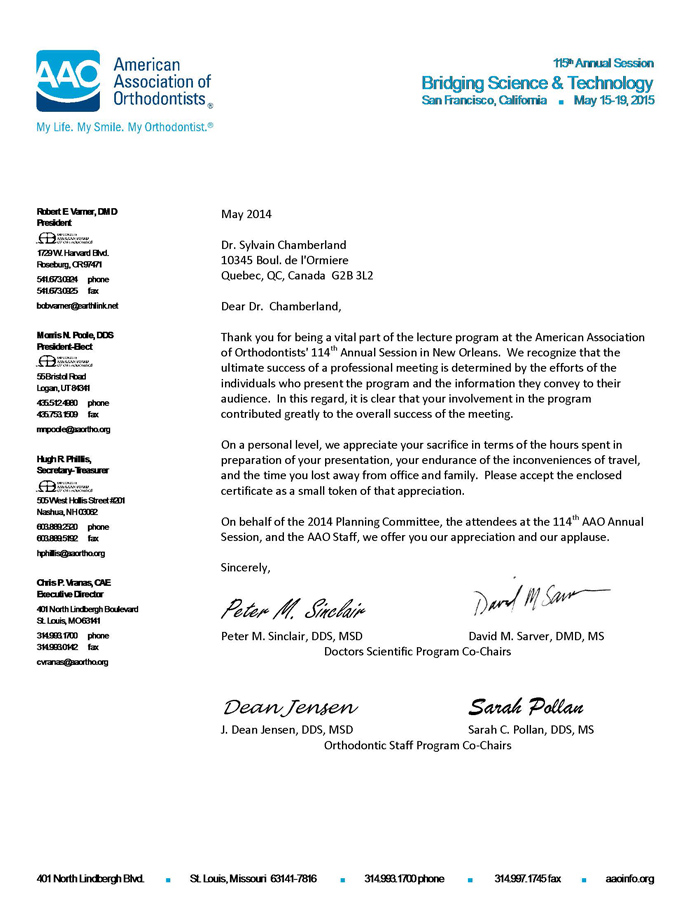 Titre de la conférence: Functional Genioplasty in Growing Patients. Un article décrivant ce projet de recherche a été soumis au journal Angle Orthodontists et a été accepté pour publication. Il sera bientôt disponible. . . .