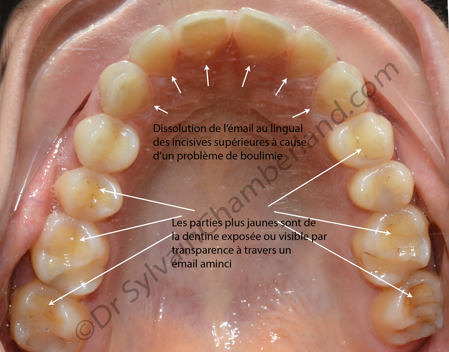 Tu pourrais intéresser ton auditoire en expliquant qu’un trouble alimentaire tel que la boulime peut causer une érosion dentaire grave, comparable à l’ingestion de soda/cola. Je publie la photo d’une personne qui est venu me consulter en janvier 2018 et qui souffrait de boulimie depuis une dizaines d’années.