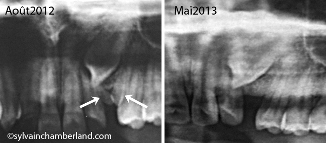 La canine droite était incluse plus profondément et mésialement. Les flèches blanches indiquent que la pointe de la canine droite dépasse la moitié de la racine de l’incisive centrale droite alors que la canine gauche est à peine vis-à-vis de la racine de l’incisive centrale gauche. La canine droite nécessitera 13 autres semaines avant qu’elle ne soit visible en bouche.