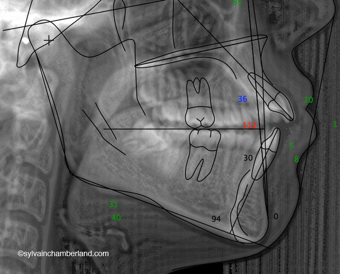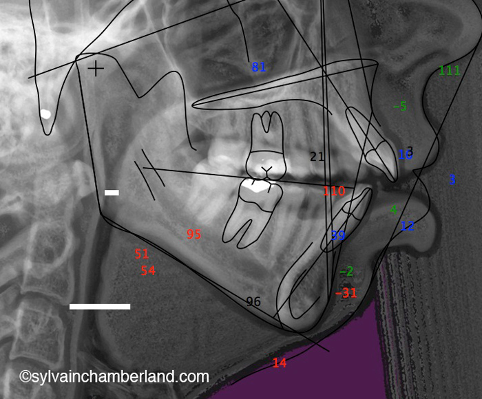 Vous pouvez aussi comparé avec le tracé céphalométrique du cas précédent avec résorption des condyles. Il est facile de constater que l’angle goniaque est au niveau de C2 et que l’espace oropharyngé est plus large.