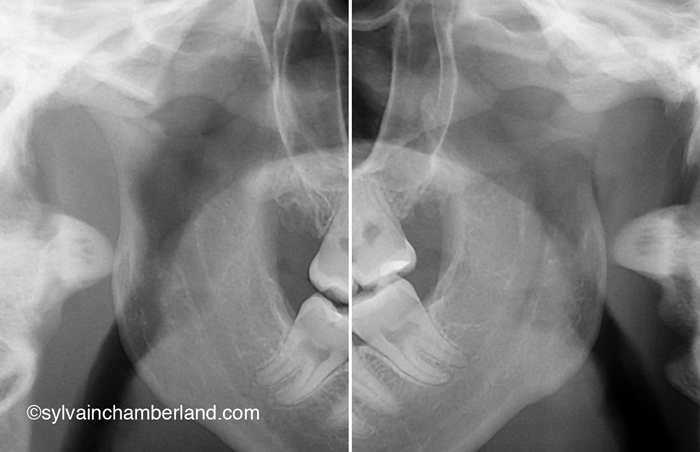 Remarquez la distance entre les racines des dents postérieures supérieures et le palais comparativement au cas suivant où cette distance est augmentée.